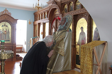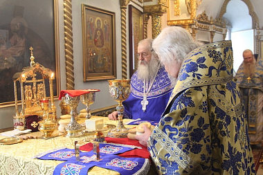 Затем наместник монастыря поздравил главу Чувашской митрополии с праздником и преподнес священноархимандриту обители заздравную просфору и букет цветов.