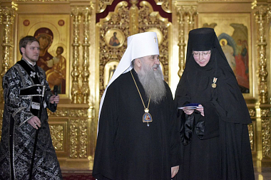 Затем за усердные труды во благо Святой Церкви и в связи с юбилеем архипастырем была награждена медалью апостола Петра монахиня Иоанна (Скворцова).