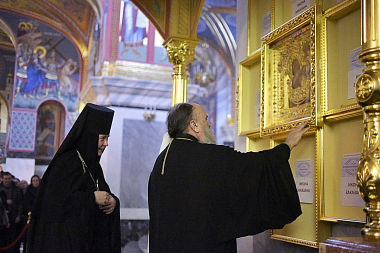 В завершение игумения София поблагодарила правящего архиерея за совместную молитву в покаянные дни Великого поста и преподнесла Высокопреосвященнейшему владыке Корсунскую икону Божией Матери.