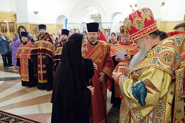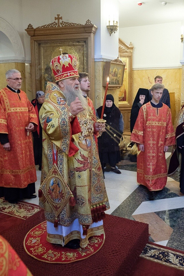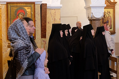 «Мы приехали сегодня в эту обитель, чтобы отметить престольный праздник, – сказал владыка в своей проповеди. – Наш календарь каждый день напоминает о святых – мы прославляем их, назидаемся их житием, восхищаемся силой, благодатью, которые они стяжали своей святостью. Мы часто утомляемся от своих послушаний. Это свидетельствует о том, что у нас не хватает силы Божией, которая в немощи совершается, как говорит апостол Павел (2 Кор. 12:9). Мы силу Божию не ощущаем – свои силы тратим и устаем. Святые же несли удивительные подвиги и совершали всё силой благодати Господней. Как стяжать ее, что нужно для этого? В первую очередь, смотреть за своим сердцем. Что в нем: есть ли место для благодати или оно чем-то другим занято? Может, оно всё в трещинах-грехах – Господь и хотел бы влить в него благодать, но всё проливается. Человек старается, что-то делает, но Господь не дает ему благодати – всё потому, что с грехом пополам. А с грехом пополам жить нельзя. Святые старались расстаться с грехом, боролись со страстями. Господь видел, что они стараются, и давал им благодать. Чтобы иметь благодать Божию, сердце должно быть чистым. Солнце светит для всех, но видят его только те, у кого глаза открыты. Закроешь – солнца не увидишь. Те, кто смотрит на Бога, получают от Него свет, тепло и благодать, а потом совершают дело, на которое Господь их призвал».