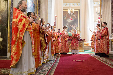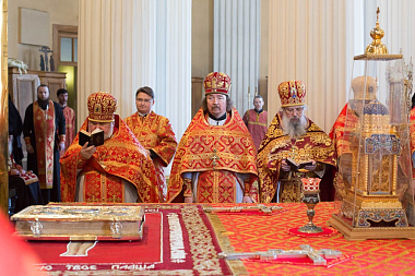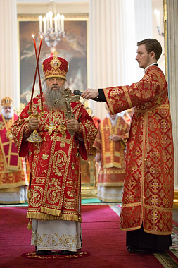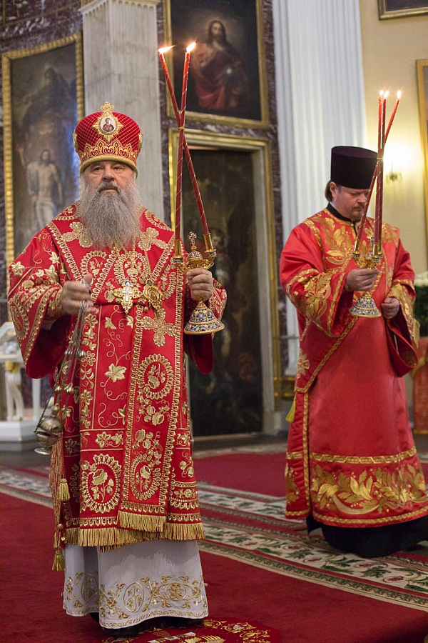 Его Высокопреосвященству сослужили наместник лавры епископ Кронштадтский Назарий, епископ Каменский и Алапаевский Мефодий, епископ Орехово-Зуевский Пантелеимон, настоятель Староладожского Никольского монастыря Тихвинской епархии игумен Варфоломей (Чупов) и секретарь епархиального управления протоиерей Сергий Куксевич и другие священнослужители.