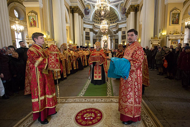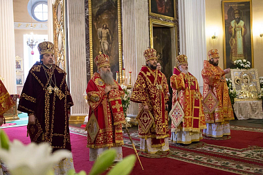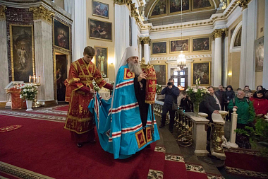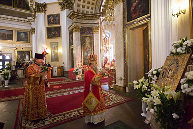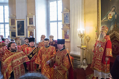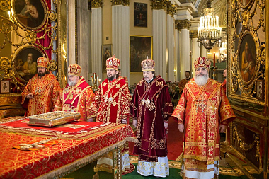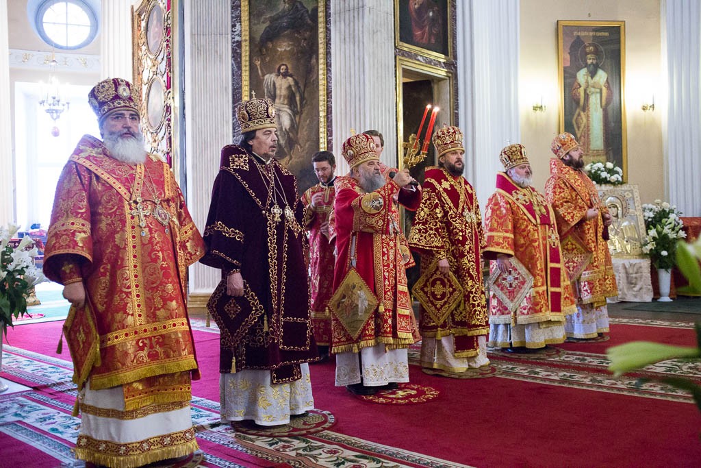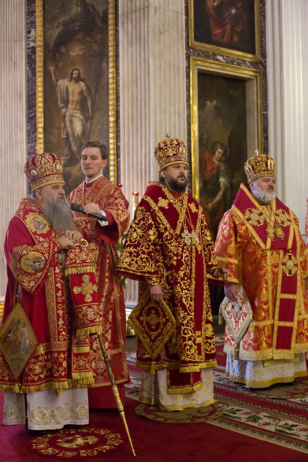 Его Высокопреосвященству сослужили архиепископ Петергофский Амвросий, епископы Царскосельский Маркелл, наместник Лавры епископ Кронштадтский Назарий с клиром, Тихвинский и Лодейнопольский Мстислав, Гатчинский и Лужский Митрофан, а также секретарь епархиального управления протоиерей Сергий Куксевич, благочинные, настоятели храмов.