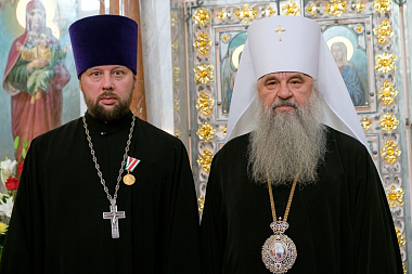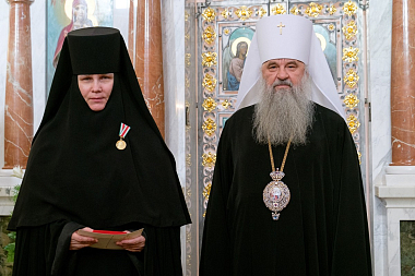 Медаль в память 100-летия восстановления патриаршества была вручена протоиерею Александру Демашкину, игумении Иларионе, казначее монахине Антонии.