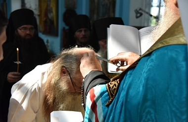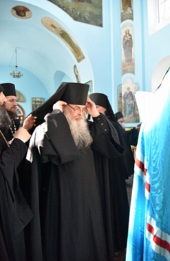 Его Высокопреосвященство постриг послушника монастыря инока Онисима (Симонова) в мантию с наречением именеми Мисаил в честь священномученика Мисаила Рязанского.