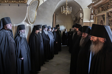 Его Высокопреосвященство принял участие в братском молебне, а также возглавил Божественную литургию в Успенском храме Псково-Печерской обители.