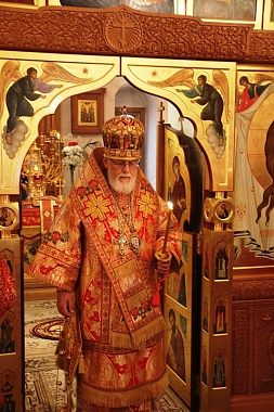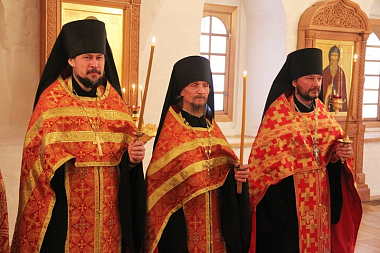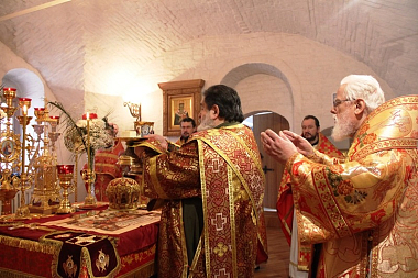 За Литургией Высокопреосвященнейшему владыке сослужили наместник монастыря игумен Димитрий (Севостьянов), братия обители в священном сане.