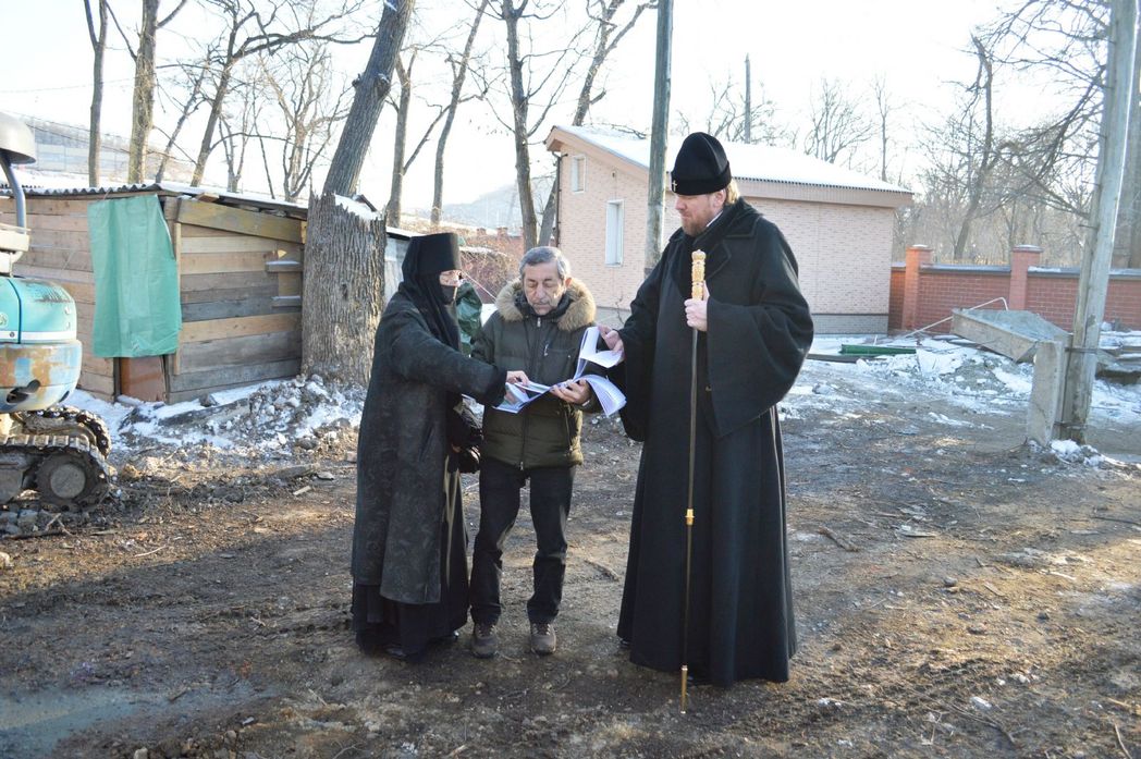 Перед всенощным бдением глава Приморской митрополии в сопровождении благочинной монастыря монахини Варвары и генерального директора ООО «ВладРеставрация» Владислава Согомонова осмотрел храм-часовню святого благоверного великого князя Александра Невского, ознакомился с проектом реконструкции пристройки к храму-часовне и ходом подготовительных работ.