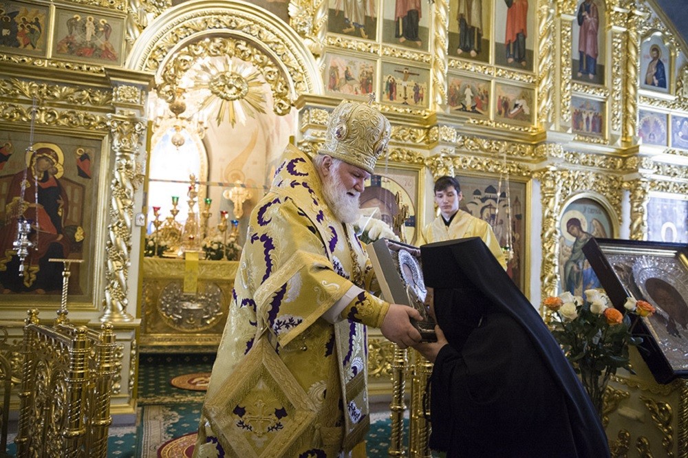 – Сегодня знаменательный день в Вашей жизни, – сказал владыка митрополит, обращаясь к игумении Варваре. – Сегодня для всей обители праздник, потому что мы чествуем Ваш день рождения. И мы молимся прежде всего о том, чтобы Господь укрепил Вас в вере, укрепил Ваши физические и духовные силы, чтобы Господь даровал Вам лета Мафусаиловы, чтобы Он сохранил Вас в чистоте и правде. И сегодня мы молимся, чтобы милость Господня пребывала с Вами.