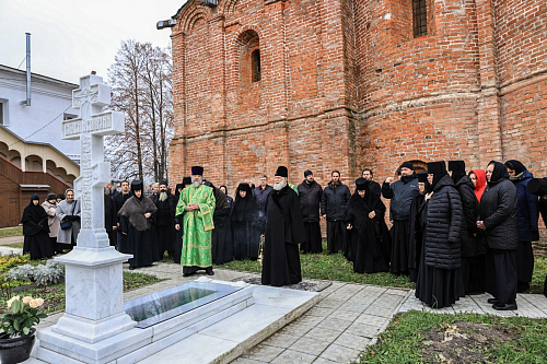 Затем владыка совершил литию по почившей игумении Миропии. Игумения Миропия (Юрченкова) отошла ко Господу 11 февраля 2022 года. Матушку похоронили за алтарем Богоявленского собора обители.