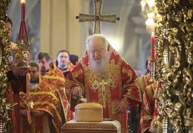 По заамвонной молитве владыка Ювеналий прочитал молитву на раздробление артоса и совершил его раздробление.