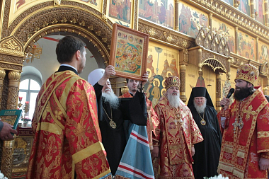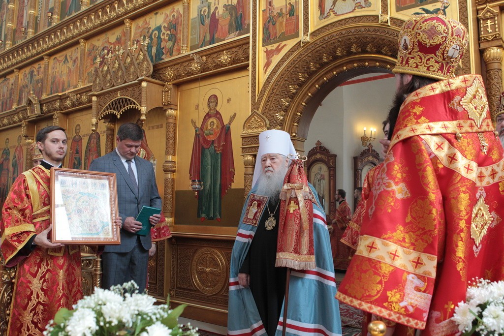 Епископ Петр преподнес митрополиту Ювеналию образ новомучеников и исповедникоподв Коломенских.