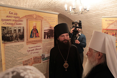 После памятного снимка в подклете Богоявленского собора состоялось открытие выставки, посвященной новомученикам и исповедникам Коломенским.