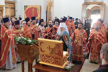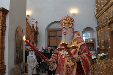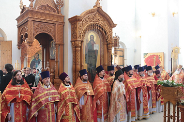 За Божественной литургией в Богоявленском соборе Старо-Голутвина мужского монастыря Его Высокопреосвященству сослужили епископ Видновский Тихон, благочинный монастырей Московской епархии епископ Серпуховской Роман, епископ Балашихинский Николай, ректор Коломенской духовной семинарии епископ Зарайский Константин, благочинный церквей города Коломны и Коломенского округа епископ Луховицкий Петр, игумен Богоявленского Старо-Голутвина монастыря игумен Варлаам (Горбунов), благочинные церковных округов Московской епархии: Егорьевского – игумен Никодим (Лунев), Зарайского – протоиерей Петр Спиридонов, Ступинского – протоиерей Евгений Ряполов, Воскресенского – протоиерей Сергий Якимов, Луховицкого – протоиерей Кирилл Сладков, Малинского – протоиерей Сергий Кулемзин, регент хора духовенства Московской епархии священник Сергий Голев, духовенство Коломны и Коломенского района.