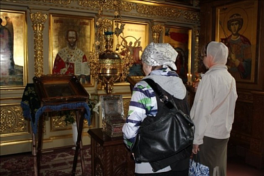 В храме во имя святителя Николая Чудотворца паломники приложились к одной из великих святынь царской семьи – кресту-мощевику. Затем все вместе помолились перед иконой святителя Николая Чудотворца, небесного покровителя Николая II, находившейся с императором в доме Ипатьева.