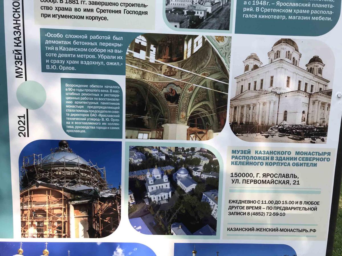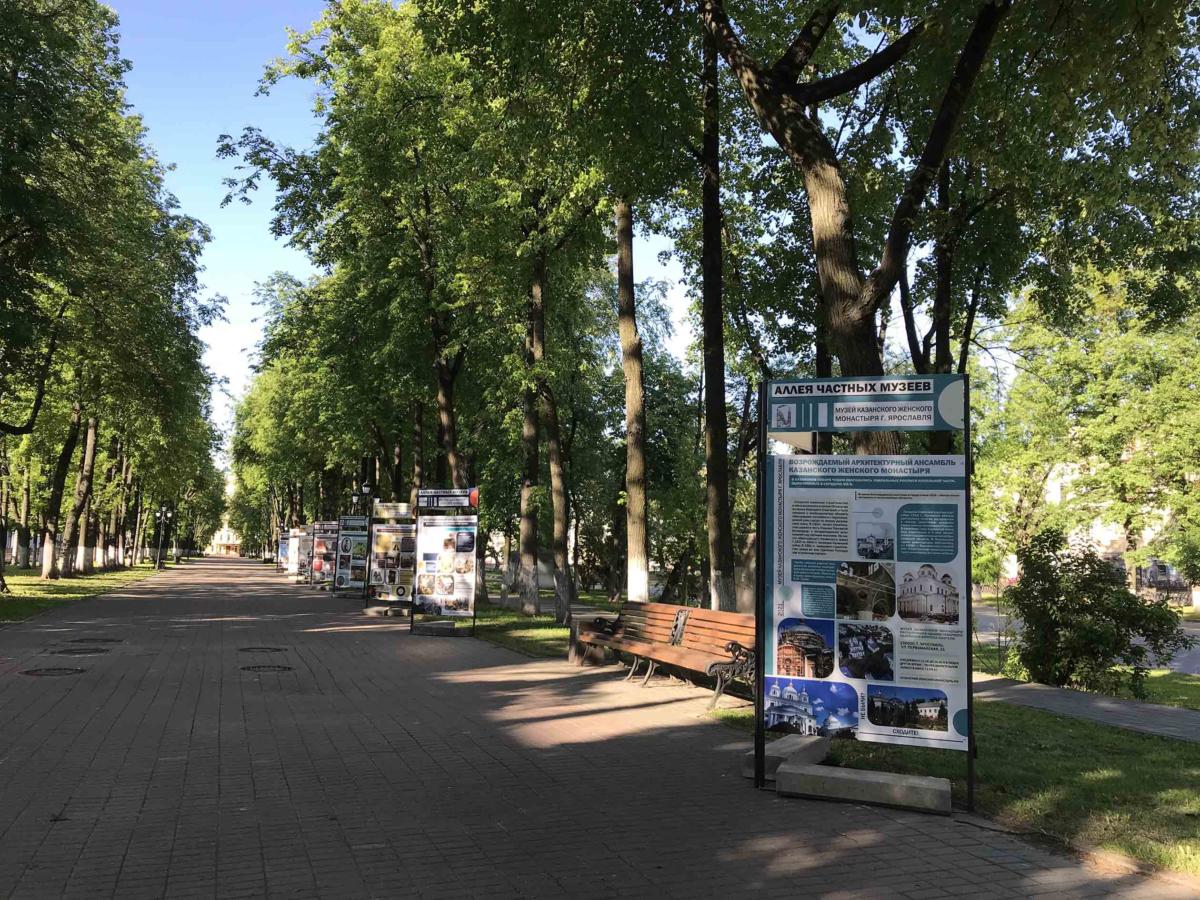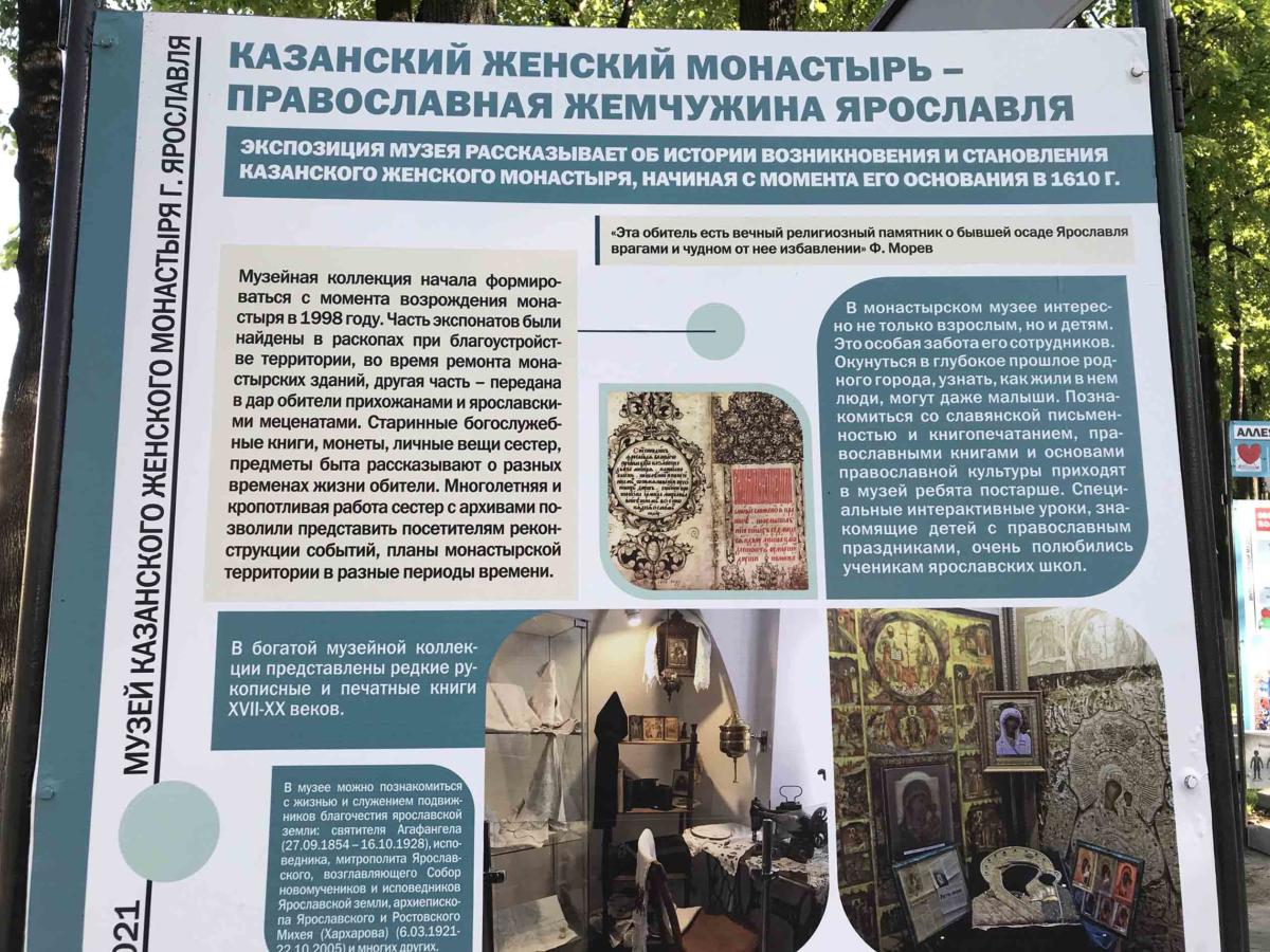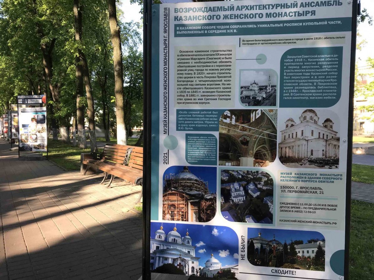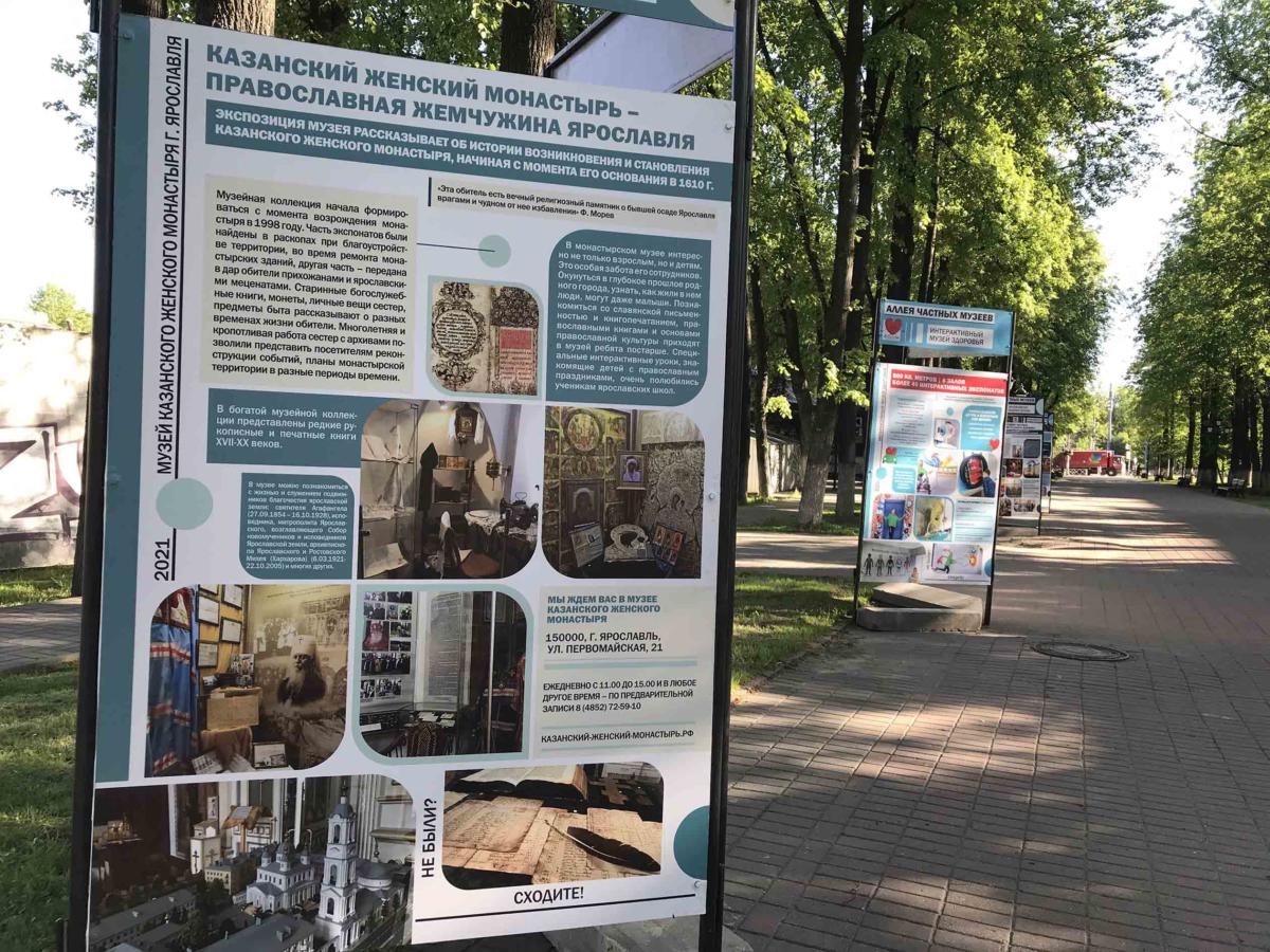 На Первомайском бульваре Ярославля открылась «Аллея частных музеев» ‒ своеобразный путеводитель по частным музеям города. Этот проект – результат сотрудничества представителей негосударственных музеев и мэрии Ярославля. На аллее присутствует и стенд Казанского женского монастыря. Из размещенной на нем информации ярославцы и гости города могут узнать об истории создания обители, об уникальной коллекции старинных книг, о тематических экспозициях, посвященных подвижникам благочестия ярославской земли.