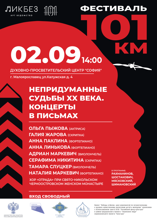 В программе - чтение отрывков из писем и воспоминаний удивительных женщин советского времени, которым пришлось проживать в Малоярославце – за 101-м километром от Москвы – Натальи Шаховской и Елизаветы Чернявской (актриса Ольга Пыжова). Произведения русских композиторов XX века – С. Прокофьева, Д. Шостаковича, Н. Мясковского, К. Шимановского в исполнении выдающихся исполнителей.