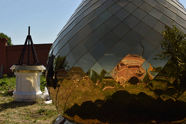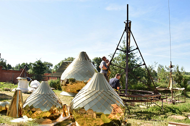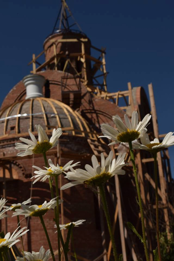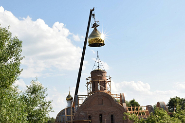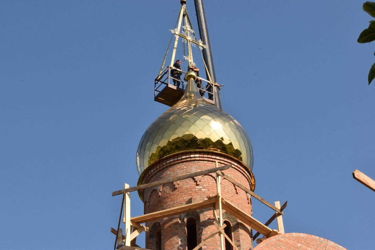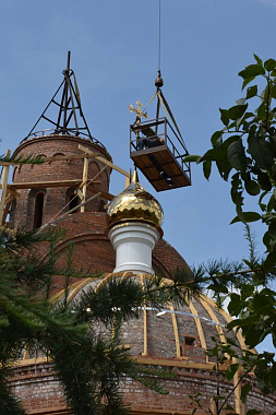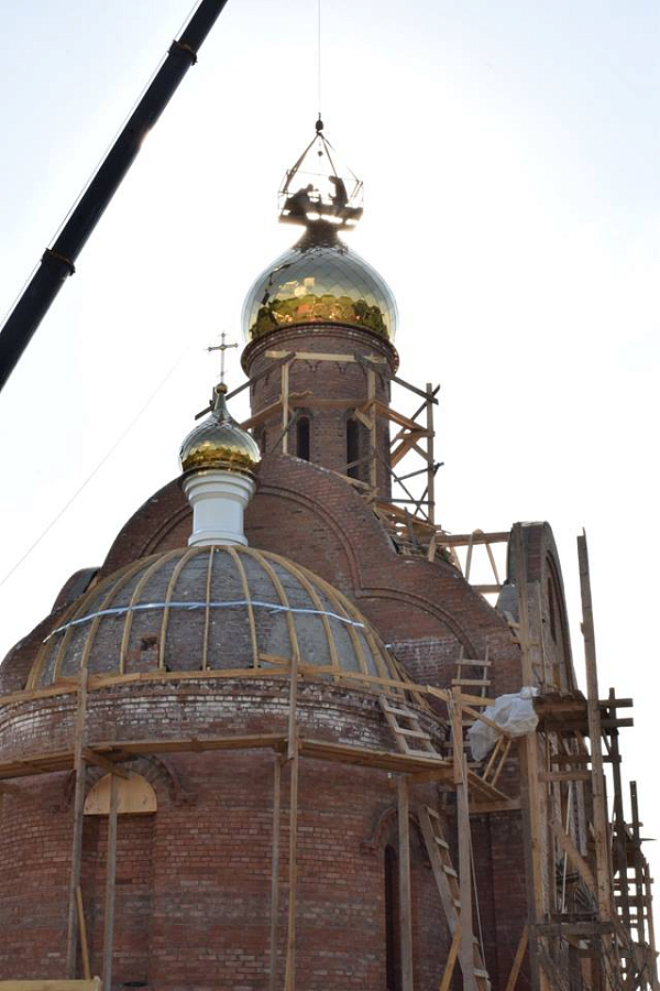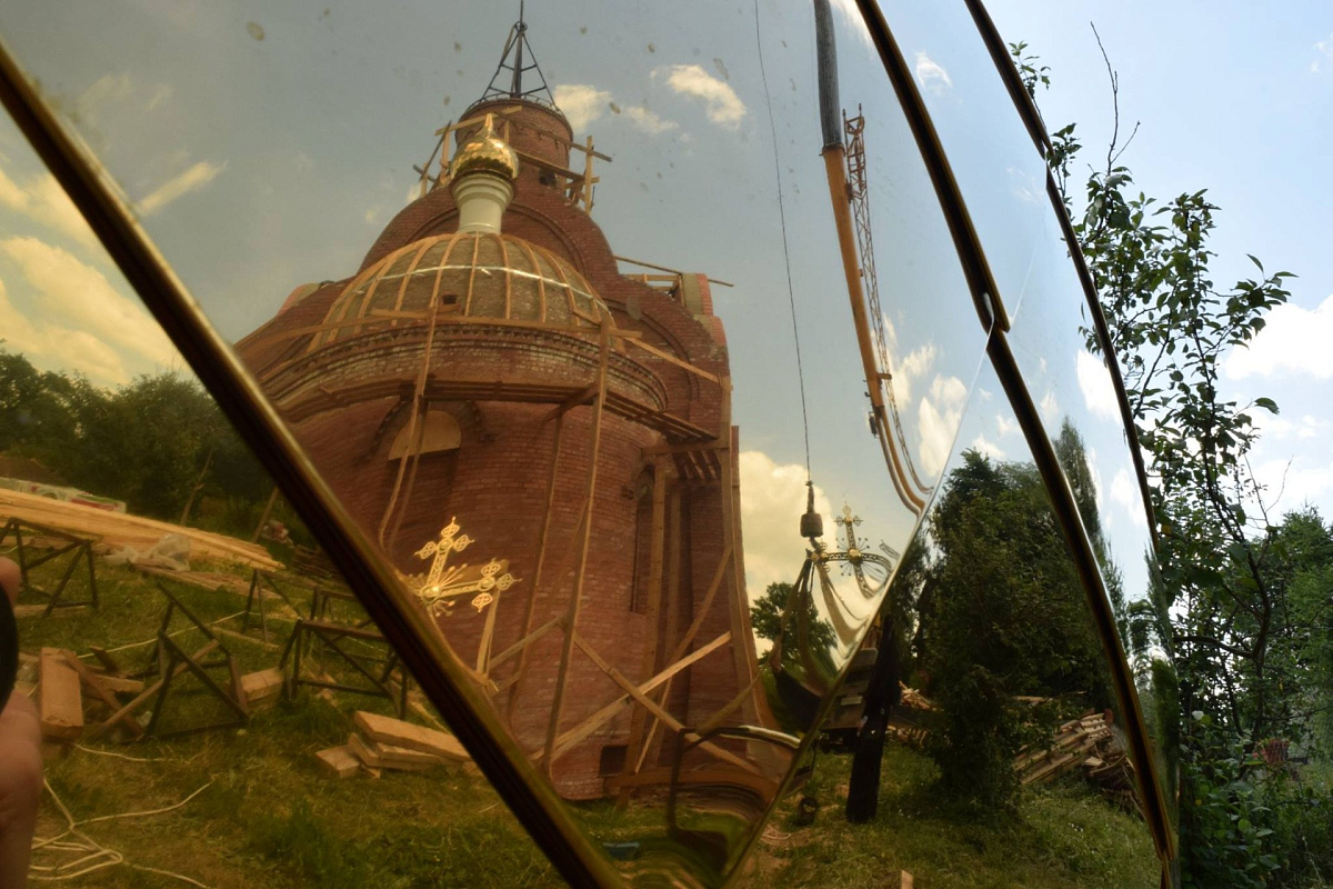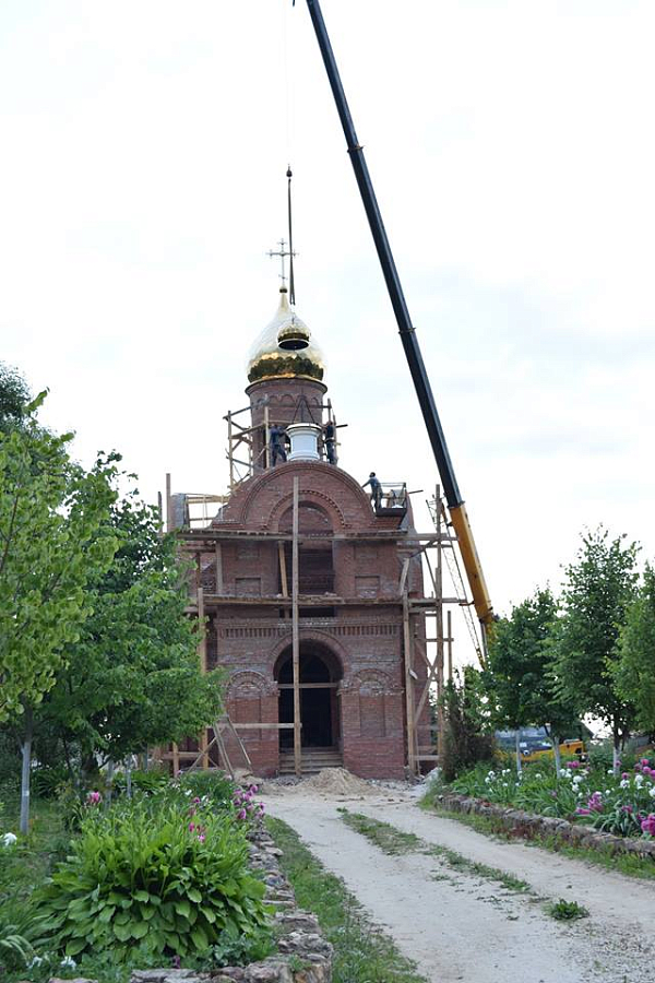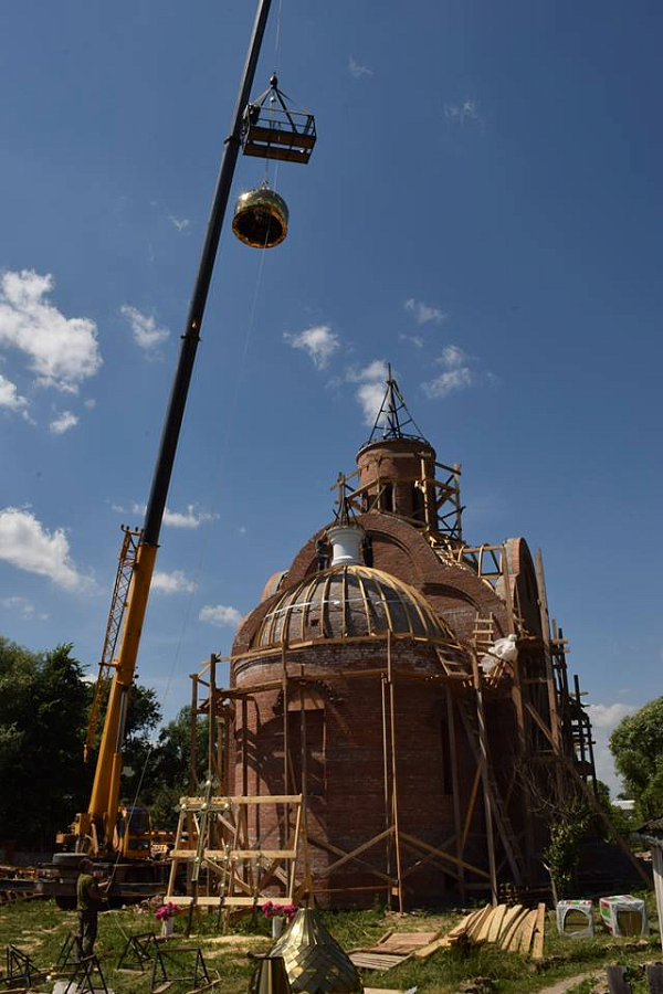 На следующий день освященные крест и купола были подняты и установлены на строящиеся храм и звонницу.