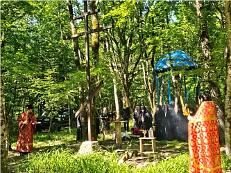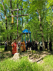 Во вторник Светлой седмицы клирик монастыря иерей Владимир Зыков совершил молебен по Пасхальному чину, помогал ему иеродиакон Николай (Тищенко). Молились у креста, установленного на месте разрушенного Покровского храма. На молебне молились игумения Неонилла с сестрами, трудники монастыря, местный священник протоиерей Евгений Султанов с прихожанами и жителями рядом расположенных станиц. Затем отец Владимир произнес краткую проповедь, потом окропил святой водой места будущего строительства, а также могилки убиенных и захороненных здесь монахинь. Крестным ходом прошли к источнику, который уже больше сотни лет бьет несколько ниже скита на горе.