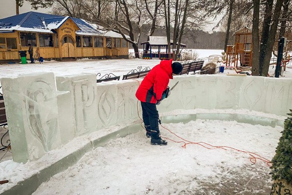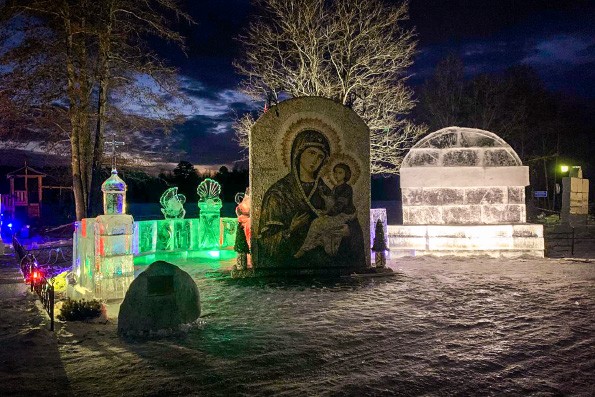 Около панно с образом Богородицы в скором времени появится надпись «С Рождеством Христовым!» Чуть дальше будут возведены две ледяные часовни с большими иконописными изображениями «Рождество Христово» и «Крещение Господне».