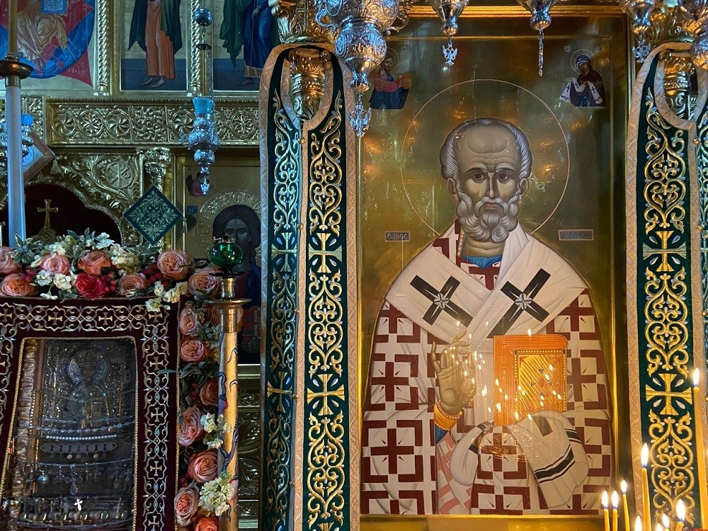 Утром 19 декабря, в престольный день, митрополит Амвросий совершил в монастыре Божественную литургию. По афонскому уставу до начала Литургии монах, облаченный в мантию, обошел монастырь и ударами в деревянное било (талантон) созвал всех в храм на молитву. По преданию, таким способом праотец Ной созывал животных в ковчег. Затем монах ударил в железное било (сидерикон), а после прозвучал короткий звон на колокольне, по случаю праздника.