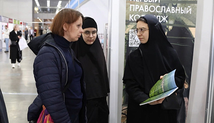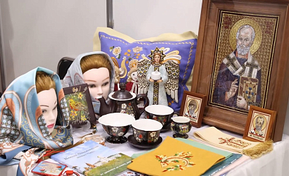 На выставочном стенде Первого православного колледжа сестры и студентки представили коллекции одежды, сольбинскую керамику и вышивку.