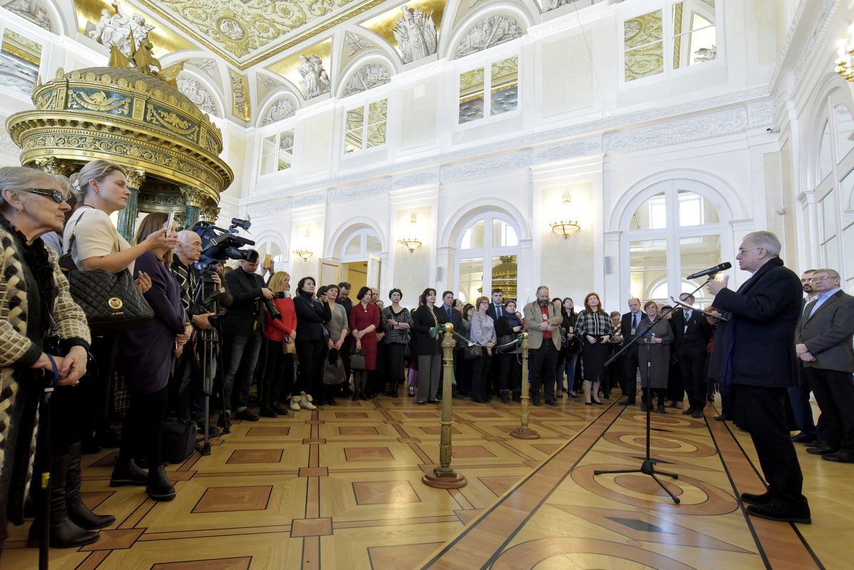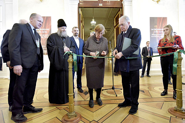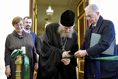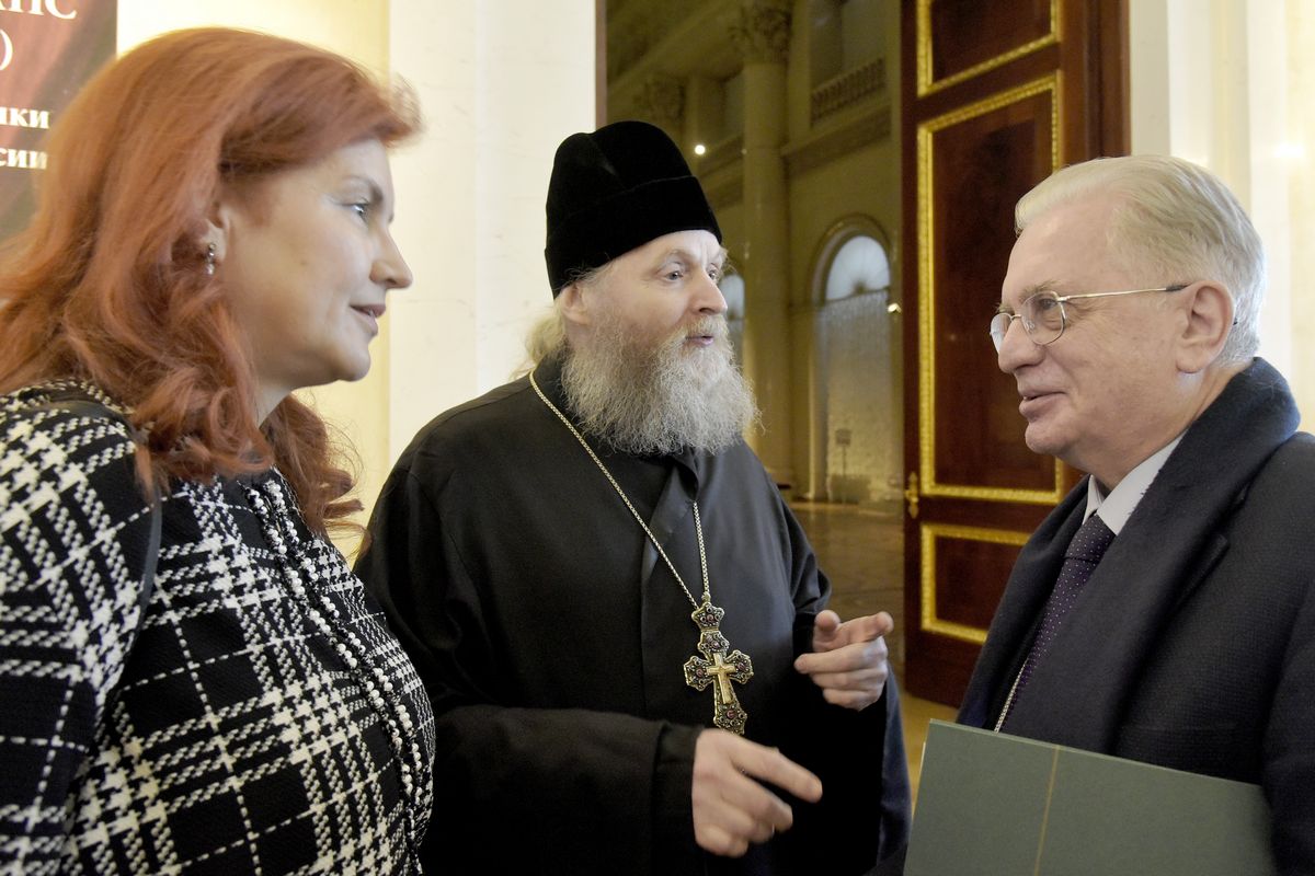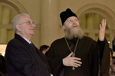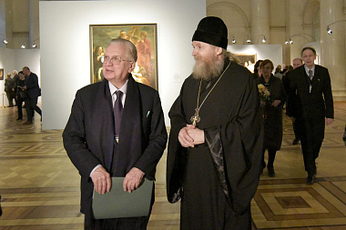Директор Эрмитажа Михаил Пиотровский поблагодарил наместника лавры епископа Кронштадтского Назария и присутствовавшего духовника обители архимандрита Виталия (Радомысльского).