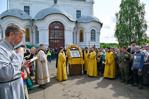 В храме молились паломники Великорецкого крестного хода, собравшиеся на Вятской земле, чтобы совершить многодневное шествие вслед за образом святителя Николая к месту обретения Великорецкого образа — берегам реки Великой.