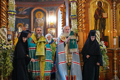 На богослужении вместе с многочисленными паломниками и прихожанами молились настоятельница Дивеевского монастыря игумения Сергия (Конкова) и сестры этой обители, настоятельницы других женских монастырей Русской Православной Церкви.