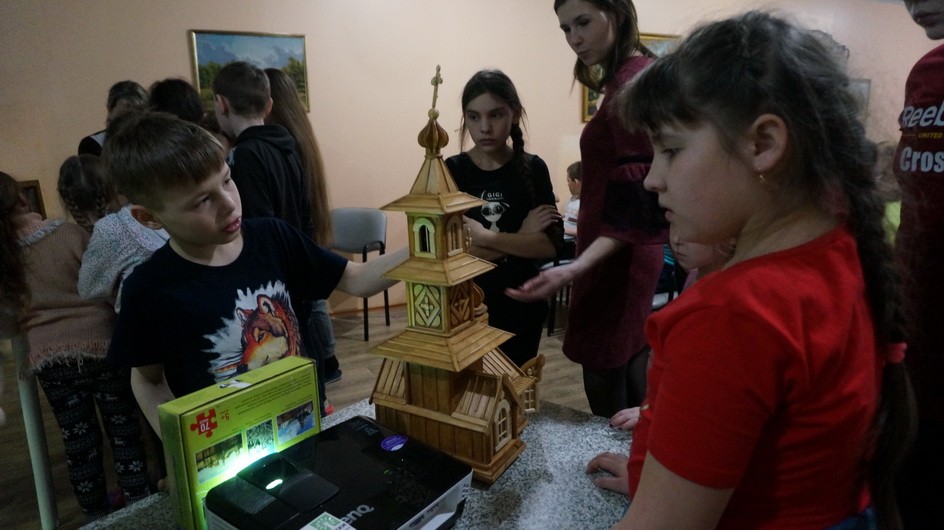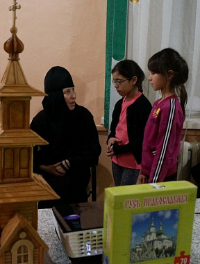 С некоторым недоумением и недоверием отнеслись вначале ребята к необычным гостям Центра. Но, услышав рассказ сестер о монастыре, получив приглашение приложиться к святыне, привезенной из монастыря, – ковчегу с частицами мощей вмч. и целителя Пантелеимона и св. Космы Бессребреника, – дети с интересом изучали деревянную модель храма, собирали картины русских монастырей из пазлов, рассматривали фотографии о жизни обители. После просмотра мультфильма «Это мой выбор» с воодушевлением разучивали песню «Ангел мой».