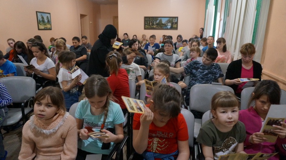 После встречи многие дети подошли к сестрам с серьезными вопросами о вере. На память о встрече монахини раздали ребятам буклеты о Всехсвятском монастыре.