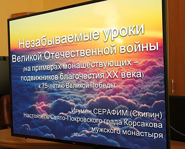 5 декабря 2019 года перед студентами факультета юриспруденции СахГУ выступил настоятель Свято-Покровского града Корсакова мужского монастыря игумен Серафим (Скипин) с лекцией на эту тему «Незабываемые уроки Великой Отечественной войны (на примерах монашествующих – подвижников благочестия XX века)».