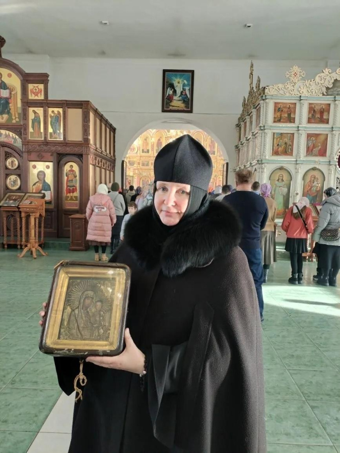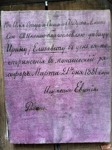 День был отмечен еще одним знаменательным событием: клириком Екатерининского храма иереем Артемием Пархоменко матушке Анне была передана дореволюционная икона Казанского монастыря. На обратной стороне Казанского образа Богородицы выполнена надпись рукой игуменьи Евгении (Таптыковой), возглавлявшей обитель с 1863 по 1893 г.: «Во Имя Отца и Сына и Св. Духа. Аминь. Сею Св. Иконою благословляю девицу Ирину / Елизавету в день ея пострижения в монашеский рясофор. Марта 21-го дня 1881 года. Игумения Евгения. Рязань».