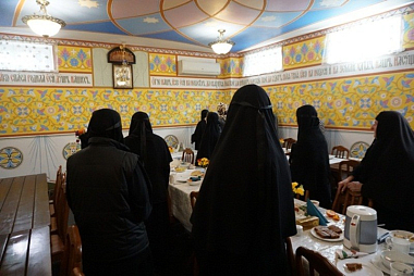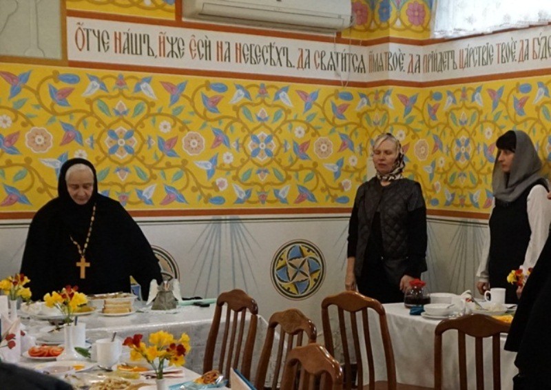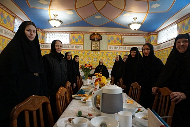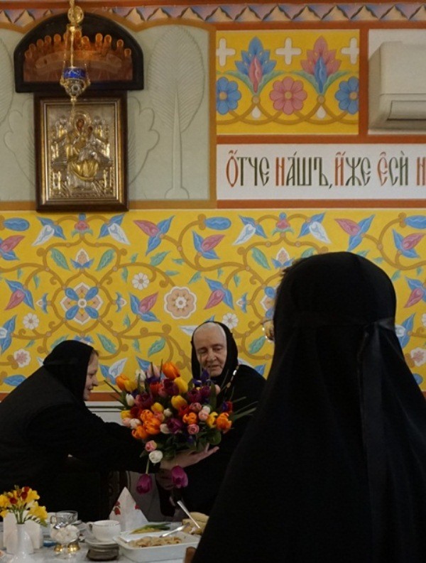 По окончании воскресной Литургии 2-й Недели Великого поста в расписанной в византийском стиле трапезной насельницы обители исполнили матушке Неонилле «Многая лета», поздравили ее с праздником и подарили большой букет весенних цветов.