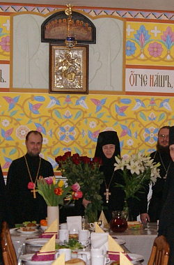 За трапезой матушка Неонилла поделилась воспоминаниями о своем постриге 15 лет назад, ставшим в ее жизни самым значимым событием после того, как она закончила свою карьеру в нефтедобывающей промышленности.