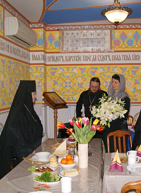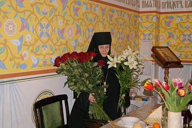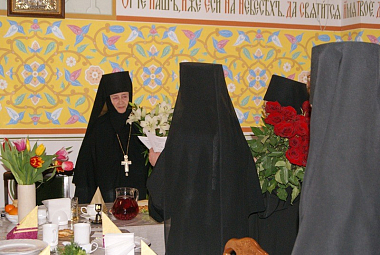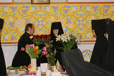 Поздравления продолжились в сестринской трапезной: матушку Неониллу поздравили прибывшие с монастырского подворья иеромонахи Вениамин (Комоликов) и Тихон (Орлов), насельницы монастыря, организаторы Паломнической службы монастыря, трудники и гости. Матушке преподнесли белые лилии, красные розы и разноцветные тюльпаны. Угощения на праздничном столе соответствовали начавшейся в этот день сплошной седмице перед Великим постом – Масленице.