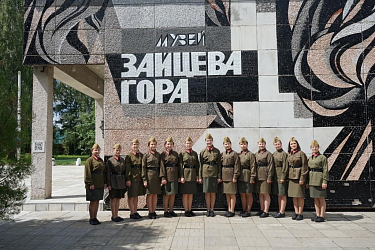 Первая остановка – Зайцева гора. Здесь, в мемориальном комплексе хор «Отрада» тоже выступил, правда с более короткой хоровой программой. После песни «Встанем» руководство музея – филиала Калужского областного музея-заповедника пригласило на экскурсию. Поражающий до глубины души рассказ об отданных жизнях, о легендарном взятии Зайцевой горы, которая бала взорвана после многомесячных работ по ведению подкопа и закладыванию 25 тонн тротила. О том, что немцы сочли произошедшее испытанием какого-то «секретного нового оружия» русских. Фотографии на память в залах музея и на фоне памятников комплекса, и автобус отправляется далее по Варшавскому шоссе.