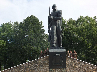 Третий крупный мемориал Великой Отечественной войны на Варшавском шоссе в сторону Ильинских рубежей – в Юхнове. Именно здесь в 1941 году сражался десантный отряд легендарного майора Ивана Старчака, изображавший целую армию. Спрятанные в лесу грузовики со снятые глушителями своим ревом убеждали немцев, что где-то здесь прячутся танки. Именно сюда направлялся передовой отряд Подольских курсантов под командованием старшего лейтенанта Леонтия Мамчича, чтобы оказать поддержку героическим разведчикам Старчака. Знакомство с этим рубежом обороны также завершается памятными фотографиями.