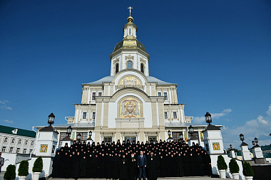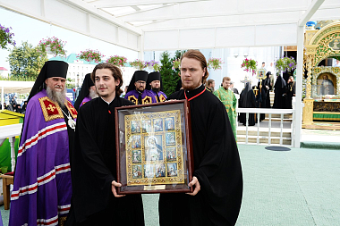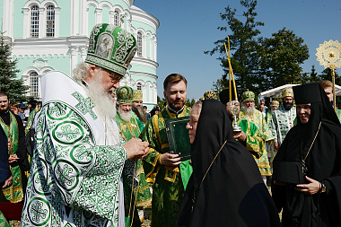От лица насельниц и паломников игумения Сергия (Конкова) приветствовала Святейшего Владыку и преподнесла Его Святейшеству написанную сестрами обители икону Собора Дивеевских святых с частицами мощей.