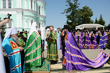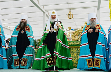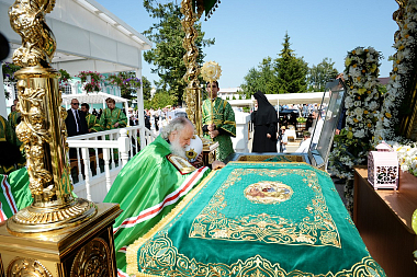 Предстоятель Русской Православной Церкви возглавил служение Божественной литургии под открытым небом на Преображенской площади монастыря у раки с честными мощами преподобного Серафима, принесенными перед началом богослужения из Свято-Троицкого собора и поставленными за Престолом.