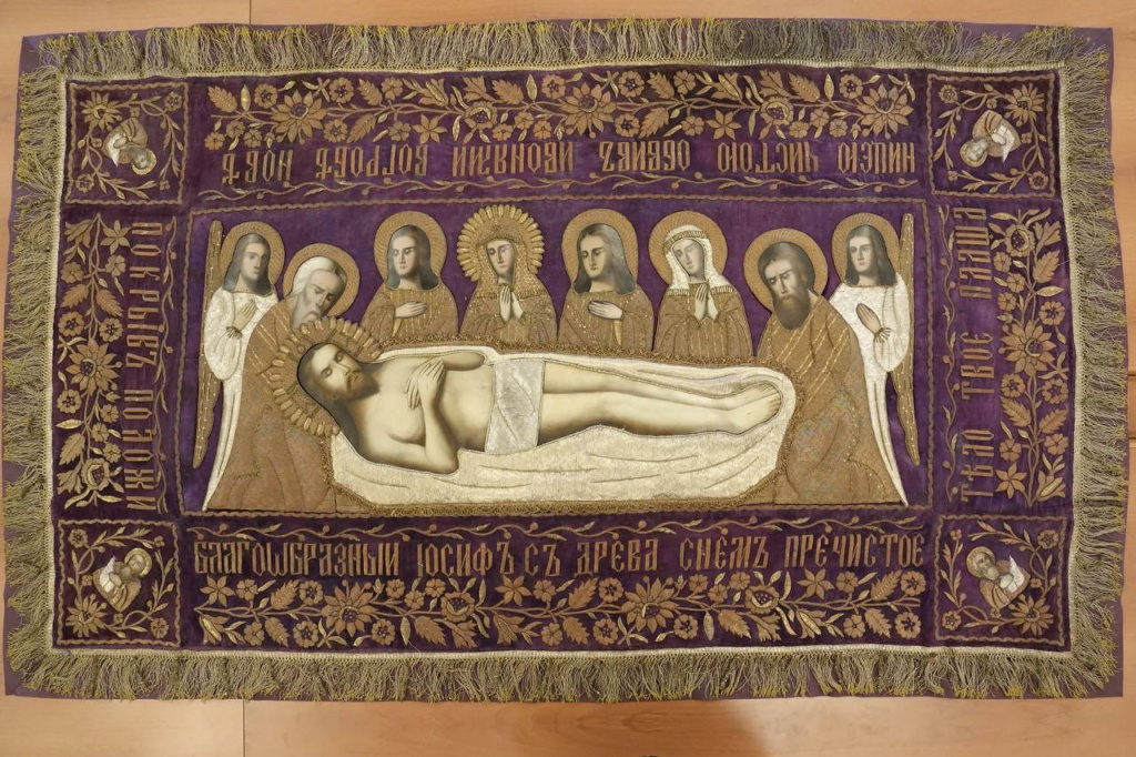 Плащаницу приобрели из частной коллекции. Происхождение ее неизвестно. Полтора года полотно, в котором все украшения выполнены вручную, реставрировали.