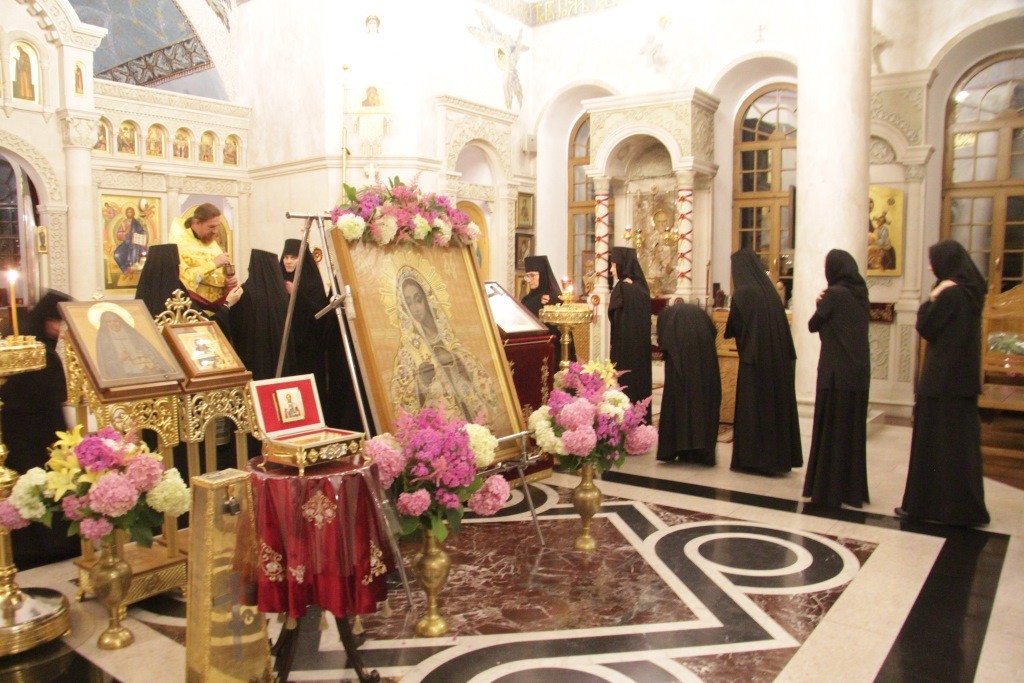 Икона была привезена в обитель во время всенощного бдения. По традиции в обители перед чтимыми образами и другими привозимыми святынями совершается череда «неусыпаемых» акафистов, прерываемых только во время богослужений. Перед Калужской иконой сестры попеременно читали всю ночь акафисты.