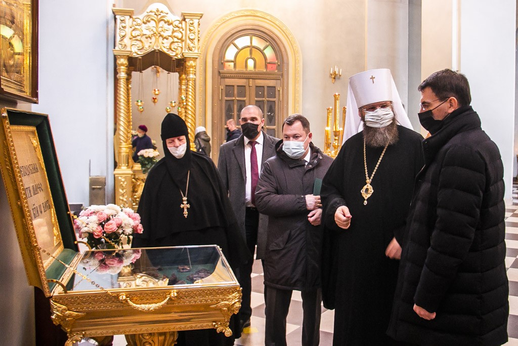 Полномочный представитель президента и глава митрополии посетили Вознесенский собор Вознесенского женского монастыря города Тамбова, где помолились перед мощами святой преподобной Марфы Тамбовской и останками вериг, которые носила святая старица.