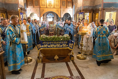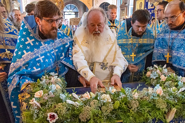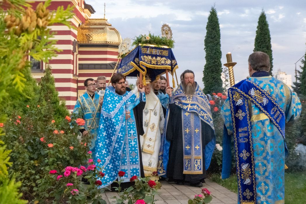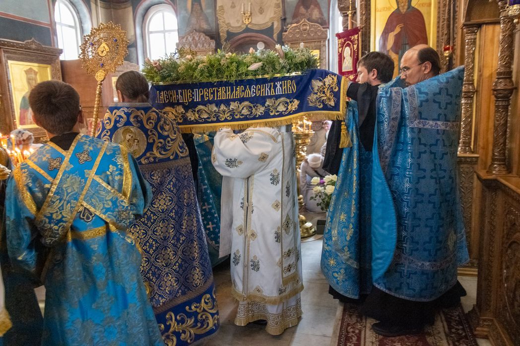 За всенощным бдением из алтаря была вынесена плащаница с изображением Успения Божией Матери. Далее был совершен чин погребения Пресвятой Богородицы.