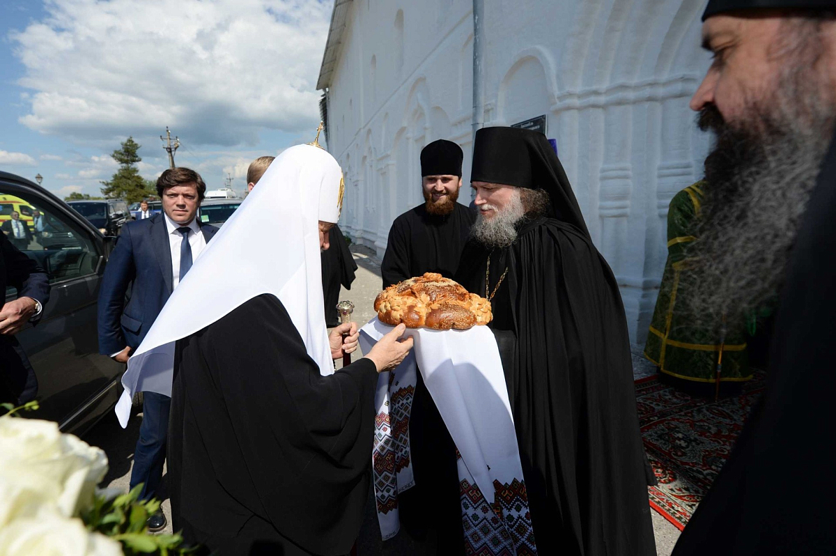 У Святых врат обители Святейшего Патриарха Кирилла встречал наместник монастыря игумен Игнатий (Молчанов) с братией обители.