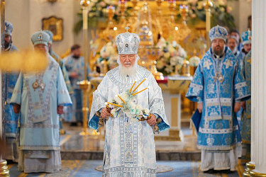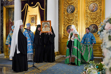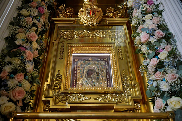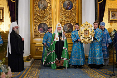 По прибытии в собор Предстоятель Русской Православной Церкви поклонился мощам святителя Варсонофия, епископа Тверского, чудотворца Казанского, и чтимому списку Казанской иконы Божией Матери.