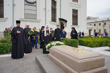 По окончании Литургии Святейший Патриарх Кирилл и архиереи, участвовавшие в богослужении, возложили цветы на могилу митрополита Феофана (Ашуркова; 21 мая 1947 г. – 20 ноября 2020 г.), которая находится за алтарем Казанского собора, и пропели «Вечную память» приснопамятному архипастырю.