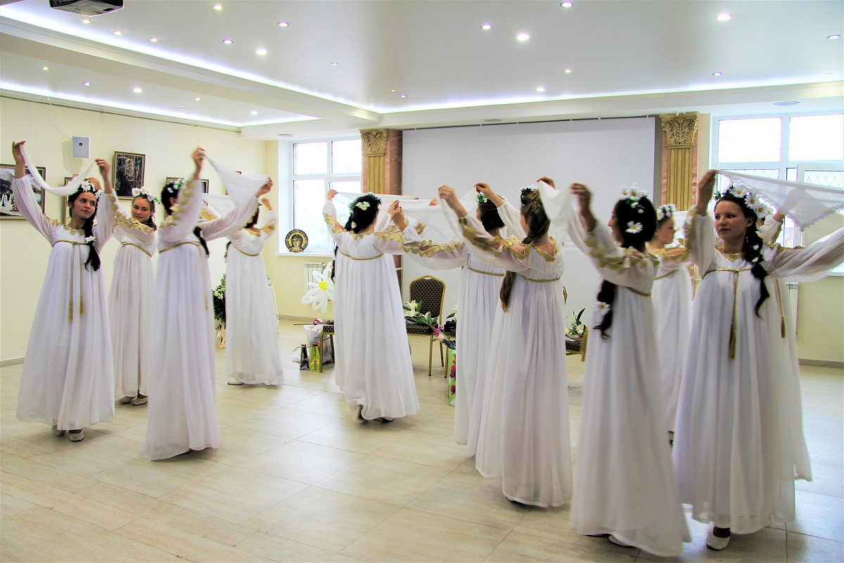 По завершении краткой торжественной части началось представление, посвященное Дню семьи, любви и верности, открывшееся русским народным танцем-хороводом в исполнении воспитанниц детского православного пансиона «Отрада».