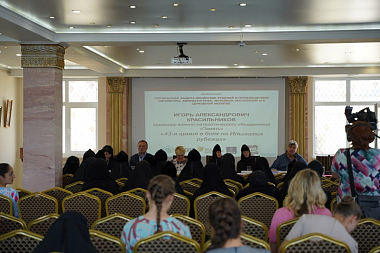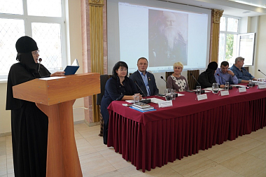 Почетными гостями конференции стали настоятельницы женских монастырей из Кемеровской и Саратовской митрополий: игумения Нектария (Седова), настоятельница Серафимо-Покровского женского монастыря г. Ленинска-Кузнецкого, и игумения Макария (Семенова), настоятельница Вольского Владимирского женского монастыря, – в прошлом насельницы Свято-Никольского Черноостровского женского монастыря. Гостями и участницами конференции матушки игумении стали не случайно. Они окончили Литинститут и поэтому знают о роли произведений искусства, в частности литературы, в сохранении исторической памяти и патриотическом воспитании молодежи. Игумения Макария как почетная гостья конференции открыла ее и зачитала приветственное слово главного организатора конференции – игумении Николаи (Ильиной), настоятельницы Свято-Никольского Черноостровского женского монастыря. В приветственном слово говорилось о цели конференции, ее связи с духовно-просветительской деятельностью монастыря и созданных при нем интерактивного музея «Малоярославец – город двух великих побед» и Духовно-просветительского центра «София», действующих при финансовой поддержке Фонда президентских грантов, а также духовном, евангельском смысле патриотического воспитания молодежи.