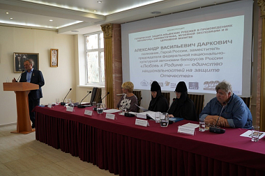 После этого краткого вступления А. В. Даркович перешел к теме своего доклада об исторических примерах Отечественной войны 1812 года и Великой Отечественной войны, когда победа была достигнута при участии и единстве представителей разных национальностей, о чем свидетельствуют и документы военных архивов о боях на Ильинских рубежах, где сражались и русские, и казахи, и узбеки, и грузины, и представители других национальностей.