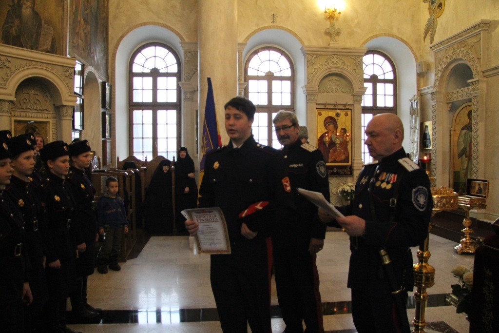 После торжественной присяги было проведено награждение отличившихся участников военно-патриотического клуба. Шесть мальчиков и девочек – по трое из каждого подразделения кадетского отряда – получили нагрудный знак «Российское казачество» I степени. Кроме того, несколько ребят и руководитель военно-патриотического клуба Н.С. Кузовкова получили почетные грамоты от атамана казачьего «Хутора Малоярославецкий» О.Ю. Грибкова.